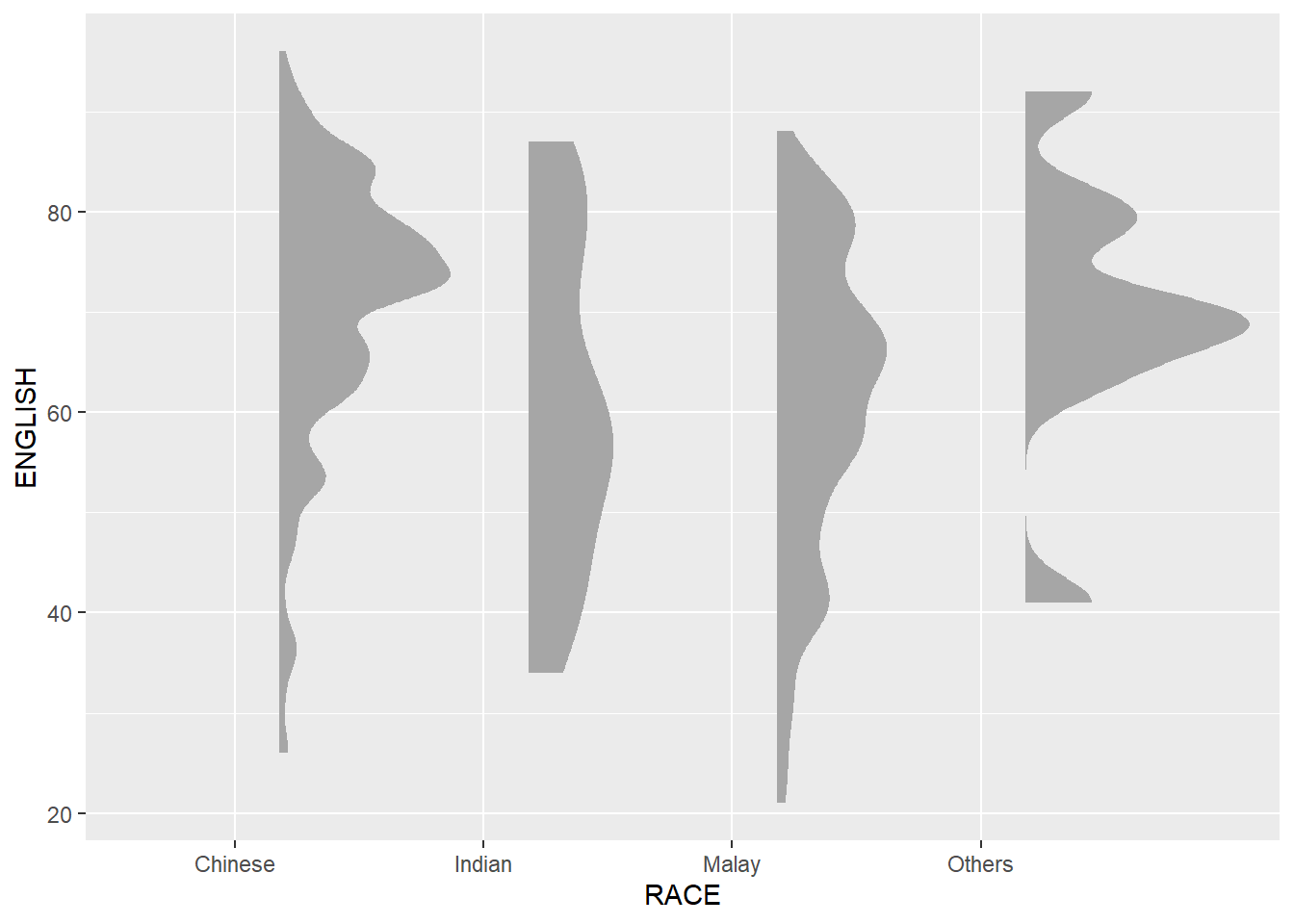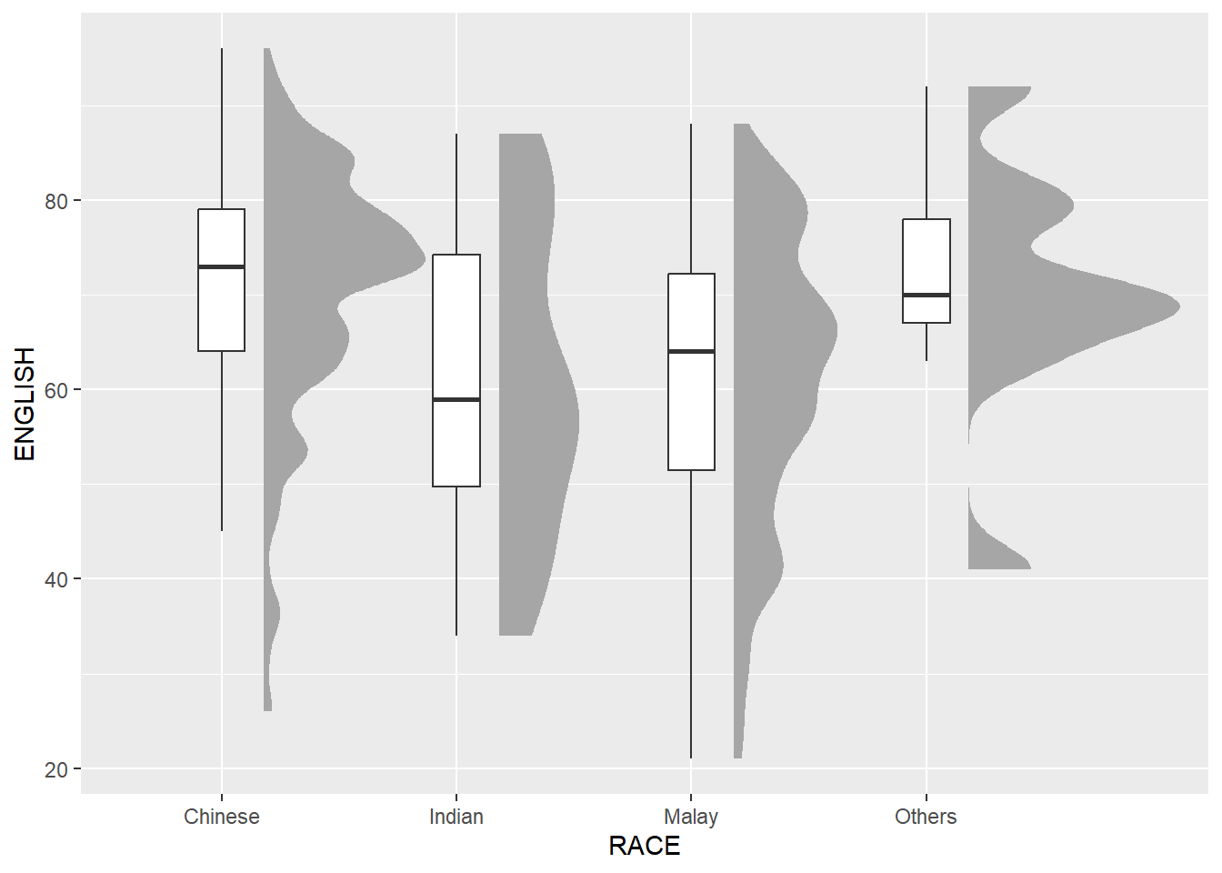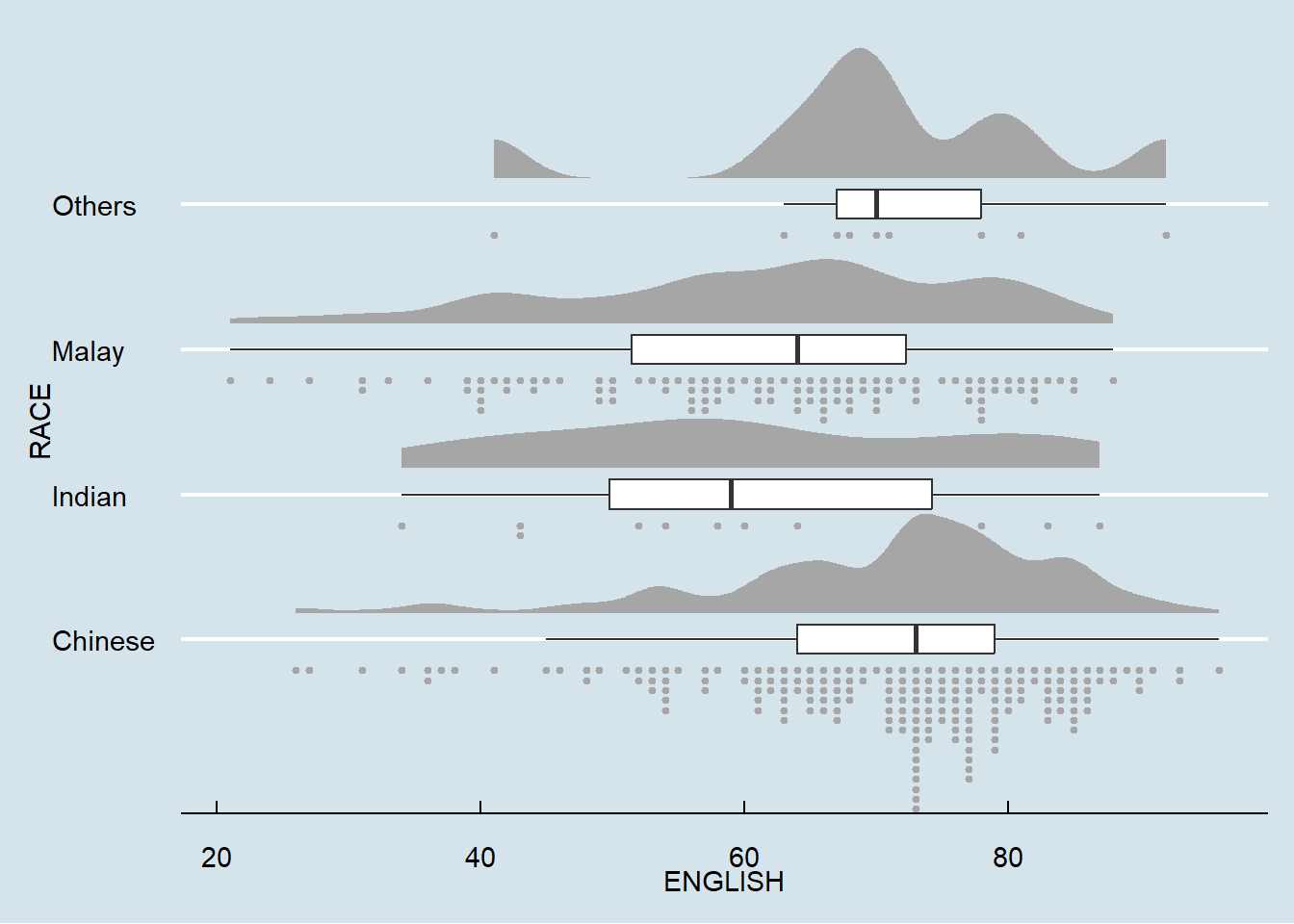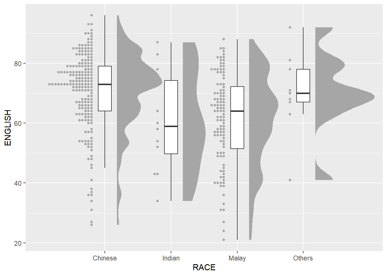 In this section, you will learn how to create a raincloud plot to visualise the distribution of English score by race. It will be created by using functions provided by ggdist and ggplot2 packages.