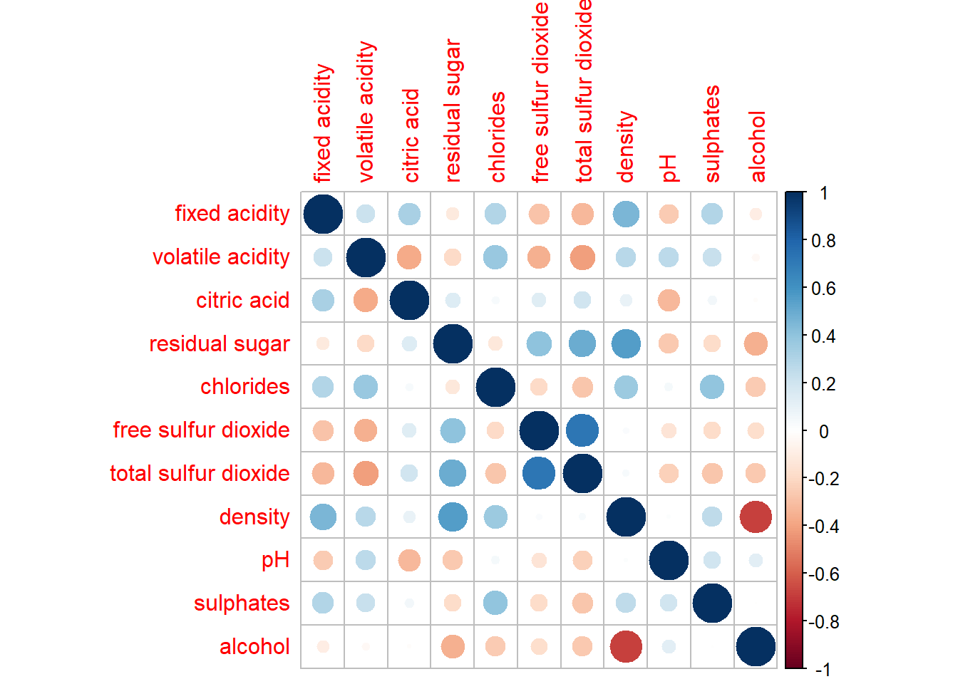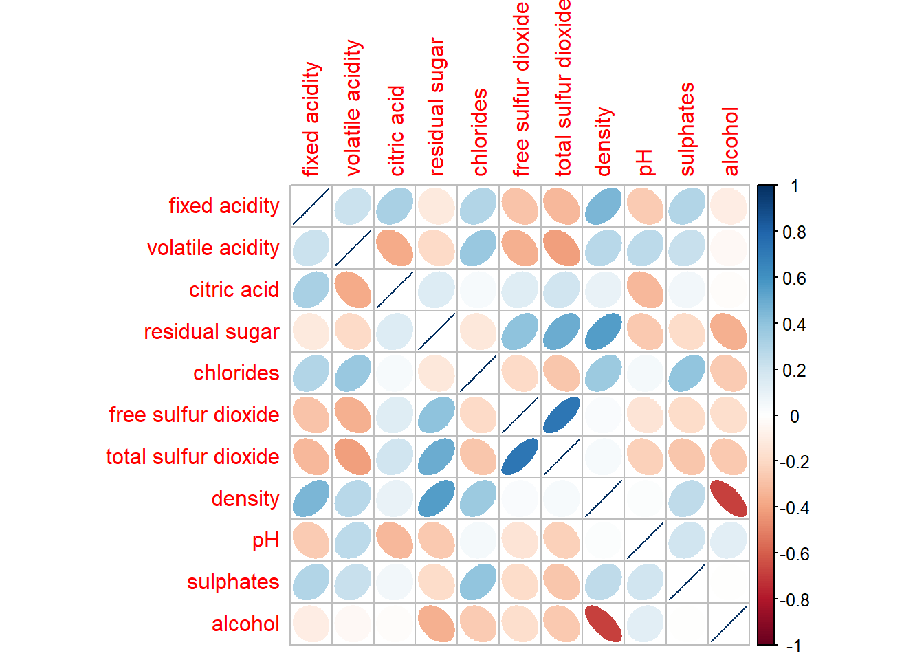 Before we can plot a corrgram using corrplot(), we need to compute the correlation matrix of wine data frame.
