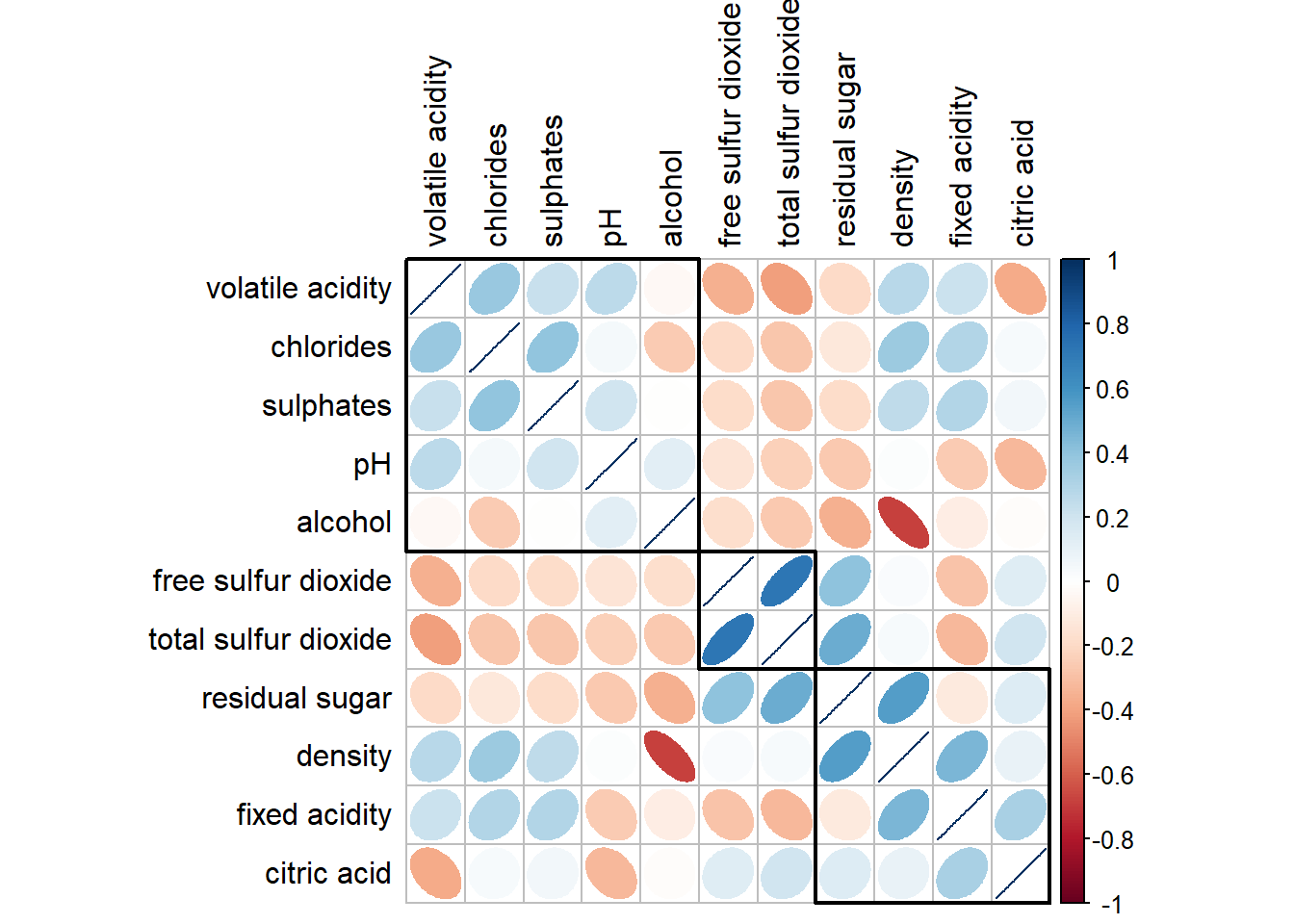 If using hclust, corrplot() can draw rectangles around the corrgram based on the results of hierarchical clustering.