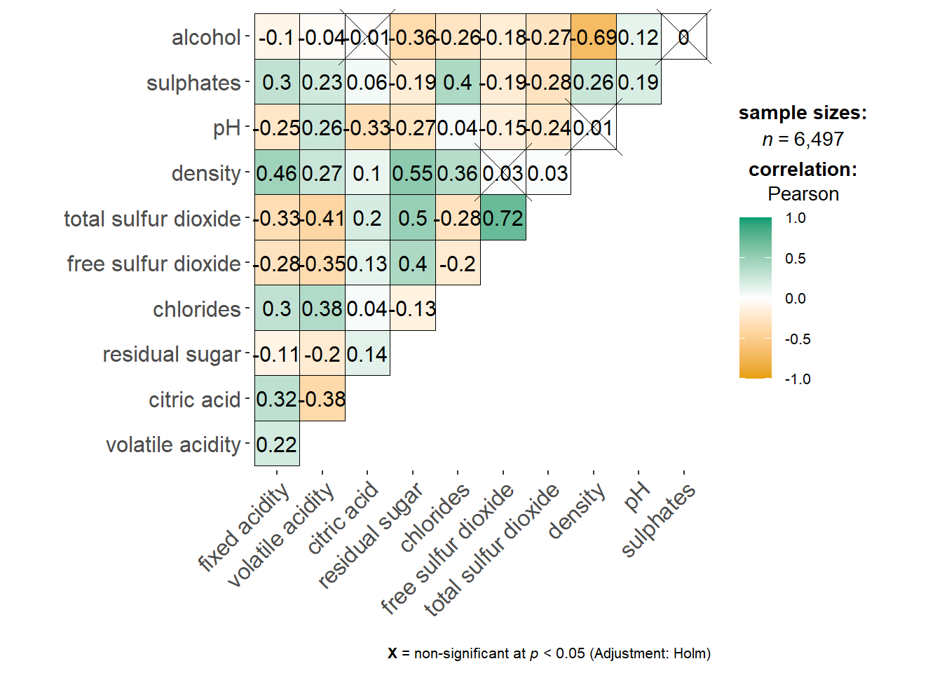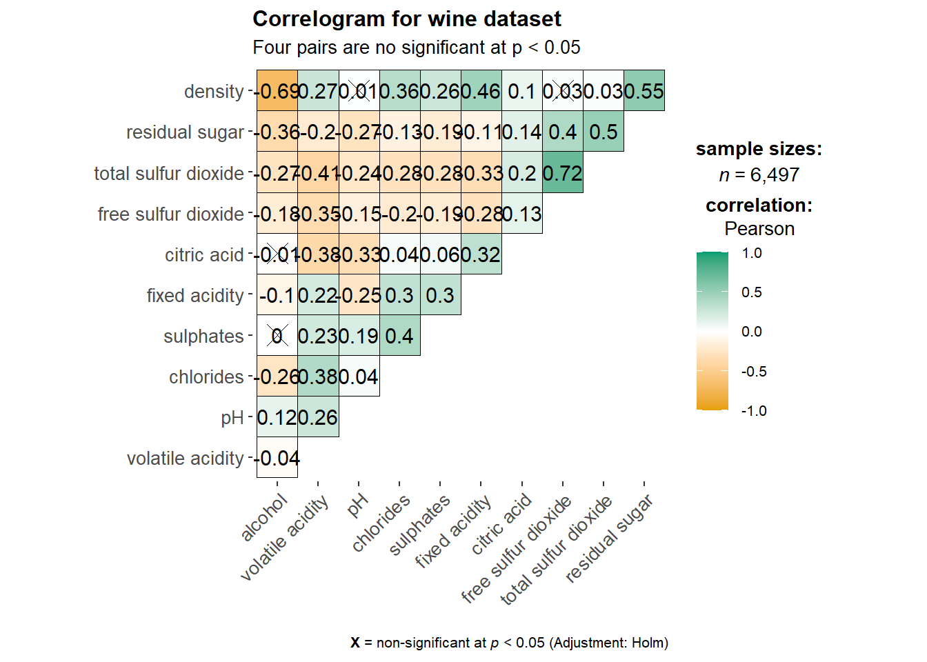 wine.sig = cor.mtest(wine.cor, conf.level= .95)We can then use the p.mat argument of corrplot function as shown in the code chunk below.