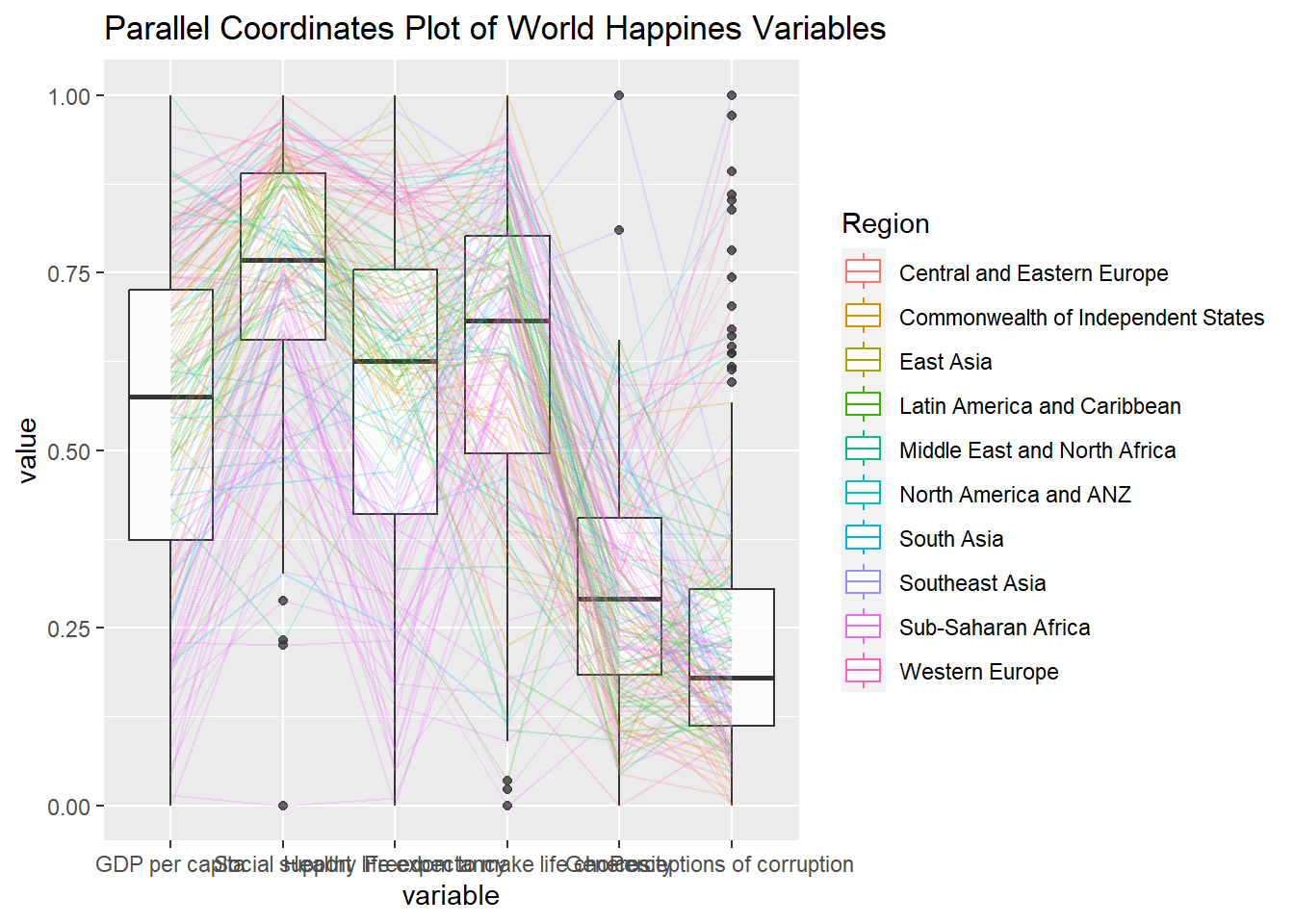 ggparcoord(data = wh, columns =c(7:12), groupColumn =2,scale ="uniminmax",alphaLines =0.2,boxplot =TRUE, title ="Parallel Coordinates Plot of World Happines Variables")