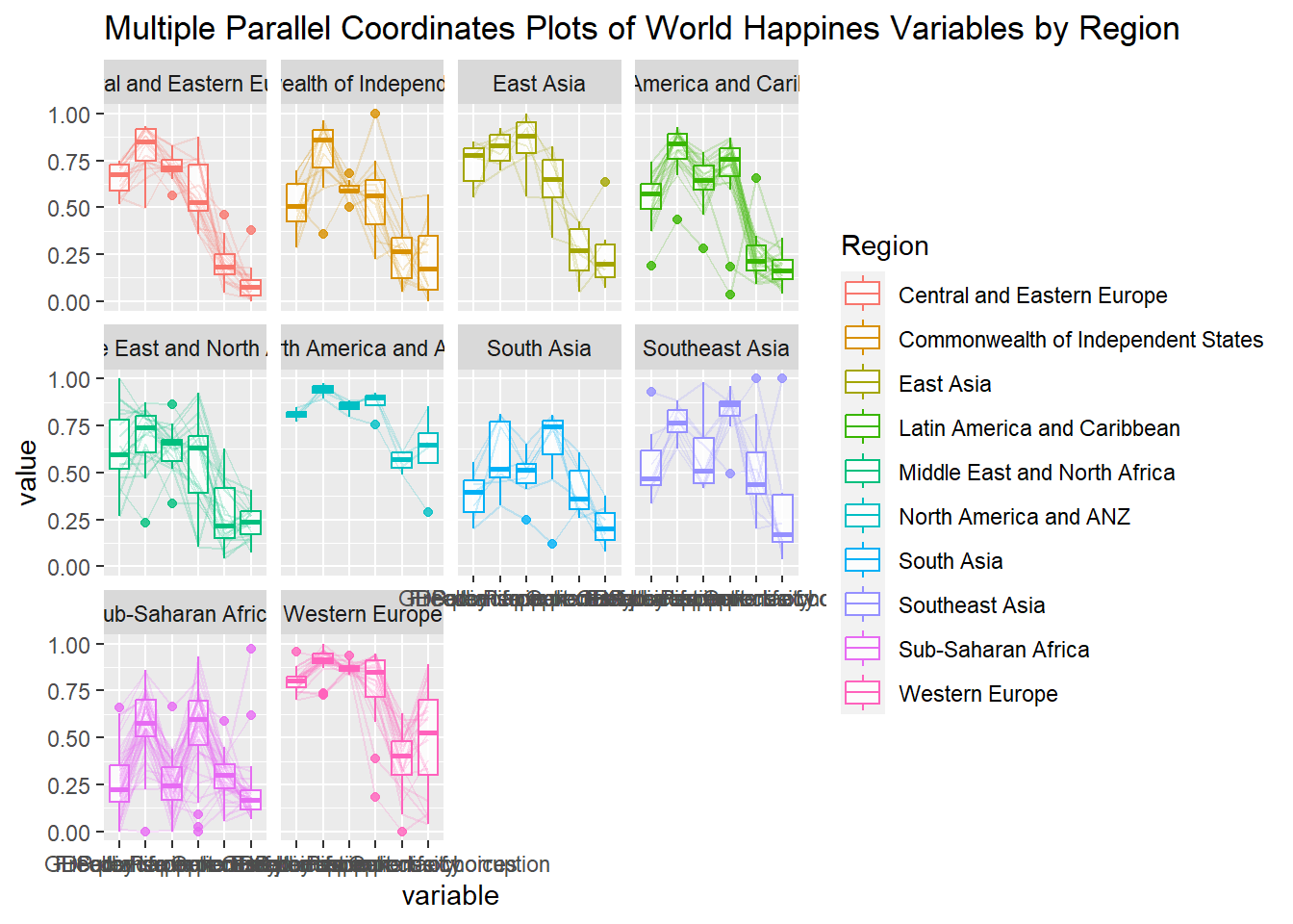 ggparcoord(data = wh, columns =c(7:12), groupColumn =2,scale ="uniminmax",alphaLines =0.2,boxplot =TRUE, title ="Multiple Parallel Coordinates Plots of World Happines Variables by Region") +facet_wrap(~ Region)
