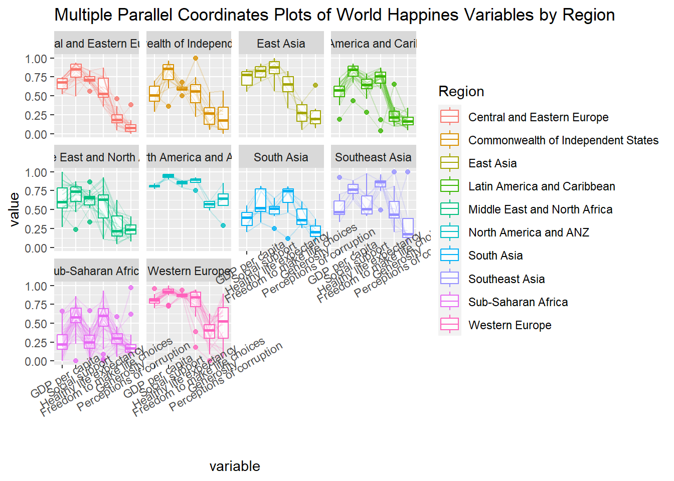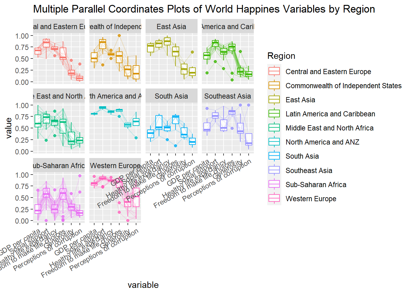 ggparcoord(data = wh, columns =c(7:12), groupColumn =2,scale ="uniminmax",alphaLines =0.2,boxplot =TRUE, title ="Multiple Parallel Coordinates Plots of World Happines Variables by Region") +facet_wrap(~ Region) +theme(axis.text.x =element_text(angle =30))