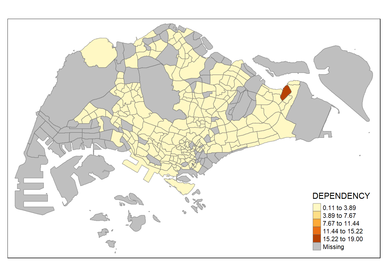 Before we get started, it is always a good practice to get some descriptive statistics on the variable before setting the break points. Code chunk below will be used to compute and display the descriptive statistics of DEPENDENCY field.