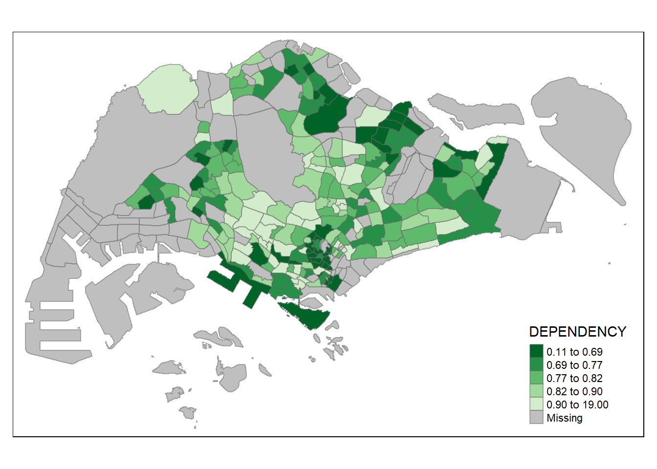 tm_layout(main.title = "Distribution of Dependency Ratio \nby planning subzone",